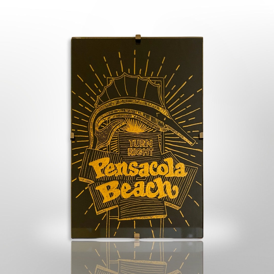 Oh how I love the neon sign that adorns the entry to my beloved beach back home. It's iconic to our little peninsula in the south, & I like to pay homage to it in various styles & media! This etching by far encapsulates the glory of how it feels to see it lit up at night.